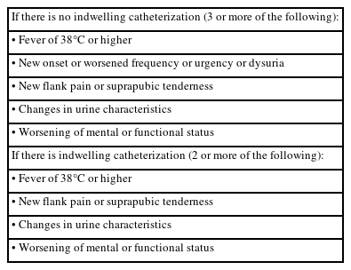 - 16. Juthani-Mehta M, Quagliarello V, Perrelli E, Towle V, Van Ness PH, Tinetti M. Clinical features to identify urinary tract infection in nursing home residents: a cohort study. J Am Geriatr Soc 2009;57:963-70.ArticlePubMedPMC