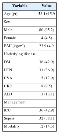 A total of 84 patients were included in this study. The mean age was 58.1±15.9 years, and 95.2% were male. The most common comorbidity was diabetes mellitus (42.9%), followed by hypertension (36.9%). Sepsis occurred in 38.1%, ICU care was required in 42.9%. Among patients who required ICU care, the mean ICU stay was 8.0 days. The overall in-hospital mortality rate was 14.3% (