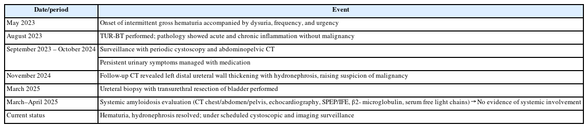 The ureteral stent was removed 2 weeks postoperatively without complications. To rule out systemic amyloidosis, comprehensive evaluation was undertaken including CT imaging of the chest, abdomen, and pelvis, along with echocardiography. Serum testing consisted of protein electrophoresis, immunoglobulin quantification, β₂-microglobulin levels, and serum free-light-chain assays. All studies showed no evidence of systemic disease involvement. The patient has remained free of symptoms, with resolution of both hematuria and dysuria. Follow-up imaging confirmed resolution of the hydronephrosis. She continues under regular surveillance with cystoscopy and imaging studies (Table 1.).