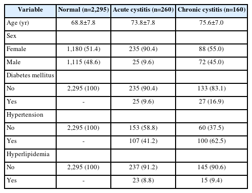 A total of 2,715 participants were included in the analysis, consisting of 2,295 normal controls, 260 individuals with acute cystitis, and 160 individuals with chronic cystitis. The cystitis groups were markedly older than normal controls, with mean ages of 73.8±7.8 years in the acute group and 75.6±7.0 years in the chronic group, compared with 68.8±7.8 years among controls. As expected, given the epidemiology of urinary tract infections, the acute cystitis group demonstrated a strong female predominance (235 women, 25 men; 90.4% female). In contrast, the chronic cystitis group showed a more balanced sex distribution (88 women, 72 men; 55.0% female), while the normal group exhibited nearequal representation of women and men (1,180 women, 1,115 men; 51.4% female) (Table 1). Age and sex were therefore incorporated as covariates in all subsequent statistical analyses to minimize demographic confounding.