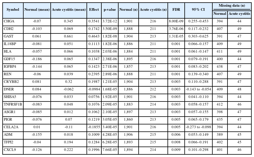 Together, CHGA, CDH2, and GAST represent the top differentially abundant plasma proteins distinguishing acute cystitis from normal individuals, collectively implicating pathways related to neuroendocrine activation, epithelial remodeling, cytokine regulation, and systemic inflammatory response. The integrated evidence from both quantitative analysis (Table 2) and visual summaries (Fig. 1) underscores a distinct plasma proteomic profile associated with acute cystitis.