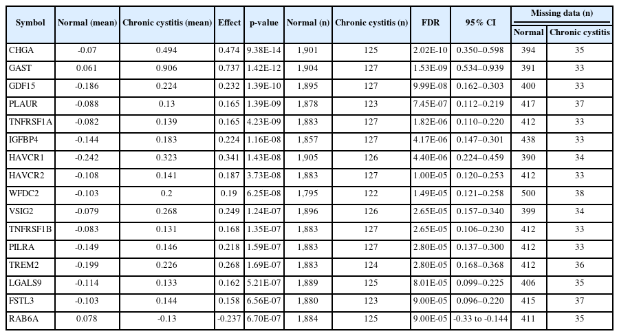 The most significantly altered protein was chromogranin A (CHGA), which exhibited markedly higher NPX levels in the acute cystitis group compared with the normal group (effect size=0.3541, FDR=7.996 × 10-⁹). CHGA is a neuroendocrine-derived secretory protein implicated in inflammatory and stress-response pathways, suggesting its potential involvement in neuroimmune mechanisms underlying cystitis.