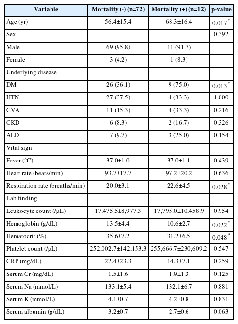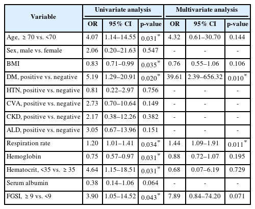 Continuous variables were expressed as means±standard deviation and compared using the Mann-Whitney U-test. Categorical variables were presented as frequencies (%) and compared using chi-square or Fisher exact tests as appropriate. Risk factors associated with mortality were identified using univariate and multivariable logistic regression analysis, presented as odds ratios (ORs) with 95% confidence intervals (CIs). In the analysis of risk factors associated with mortality, we assessed potential multicollinearity between respiratory rate and FGSI, as respiratory rate is a direct component of the FGSI. Variance inflation factor analysis demonstrated acceptable values (<2.5), suggesting no significant multicollinearity. Variables with p<0.05 in univariate analysis were entered into multivariable models. A p-value <0.05 was considered statistically significant. All analyses were performed using IBM SPSS Statistics ver. 26.0 (IBM Corp., USA).